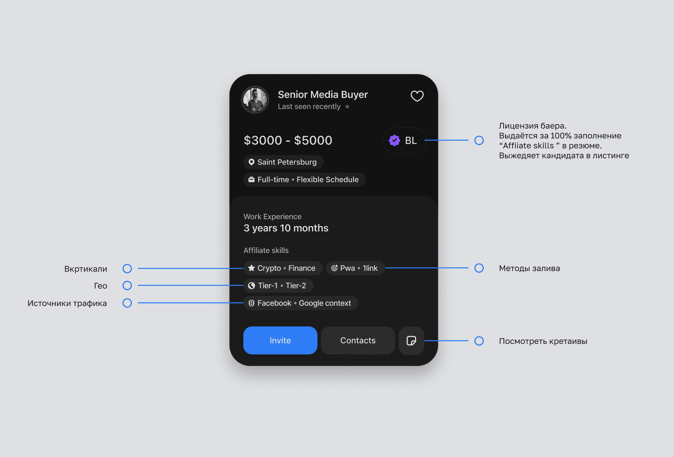 Important information includes which traffic sources the candidate worked with and what targeting methods they used.